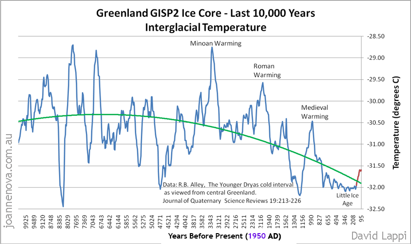 Below is an illustration graph of how they do that.  Notice the short red line on the lower right corner of the graph. This is the part that is used to support their claims.   Such dishonesty is downright criminal! So how do they get away with this?  It is blind faith. There can be no other explanation. We are so in awe of the highly educated segment of our society that we swallow anything they have to say, no matter how wacky.  Actually, there is another reason. Government study grants have been given to study the craziest ideas,such as the efect of global warming on diabetes and dozens of ridiculous scenarios that only a demented person would think of.  Naturally, so-called climate science must be upheld as scientific to continue receiving the money they need to support their livelihood. There is a brotherhood of these self-described climate scientists who support each other and ridicule anyone who questions the "science".  This graph, derived from glacial temperatures, indicates a downward trend in global temperatures.  Actually, if you look at the graph below, and notice the correlations, you can see there are atmospheric consequences of CO2 concentrations, but not as these climate scientists are predicting.
