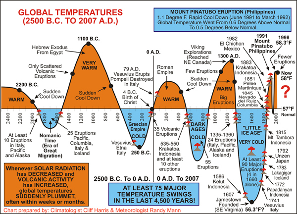 Notice the short red line on the lower right corner of the graph. This is the part that is used to support their claims.   Such dishonesty is downright criminal! So how do they get away with this?  It is blind faith. There can be no other explanation. We are so in awe of the highly educated segment of our society that we swallow anything they have to say, no matter how wacky.  Actually, there is another reason. Government study grants have been given to study the craziest ideas,such as the efect of global warming on diabetes and dozens of ridiculous scenarios that only a demented person would think of.  Naturally, so-called climate science must be upheld as scientific to continue receiving the money they need to support their livelihood. There is a brotherhood of these self-described climate scientists who support each other and ridicule anyone who questions the "science".  This graph, derived from glacial temperatures, indicates a downward trend in global temperatures.  Actually, if you look at the graph below, and notice the correlations, you can see there are atmospheric consequences of CO2 concentrations, but not as these climate scientists are predicting. There is significant evidence that prior to the flood described in Genesis, the world climate was tropical and life so flourished in that CO2 rich environment, growth of both plants and animals was accelerated to produce massive quantities of carbon based life. (clearly evidenced in our coal and oil deposits) It has been estimated that ferns in that environment (7-10,000 ppm C02) grew up to 15 meters. As a result of the flood, nearly all of it was buried under tons of sediment. The catastrophic shifts in the sea floor and the breaking apart of the land mass, along with  seismic and volcanic activity resulted  in the mountains and valleys we see today. What does academia say about that scenario? Of course, they scoff at the idea that there ever was a global flood, mainly because it came from the Bible. I say that's fine. If you have a better theory, put it forward, but try using real science to back it up.